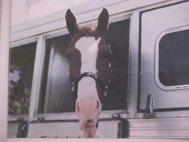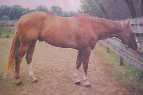 Bandit came to us back in 1997 at the age of 10. We purchased him from an equestrian center on Long Island, New York. He had been trained English and Western, had shown in the hunter divisions, and was used as a lesson and trail horse. He is still semi-active in our lesson program and is always a hit with the kids because of his easy going temperment and goofball personality. Always the favorite of the timid or scared beginners he goes as slow as he can and makes them feel comfortable...he gets quite comfortable himself as you usually have to end up pushing for a trot halfway through the lesson! = )